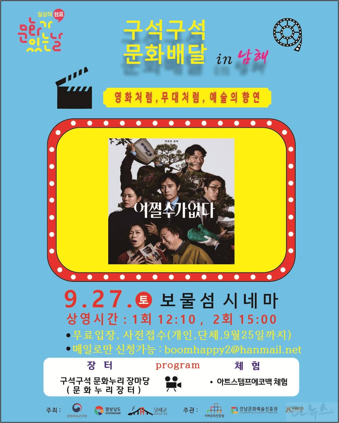 남해군은 오는 9월 24일(수)과 27일(토) 두 차례에 걸쳐 2025 문화가 있는 날 ‘구석구석 문화배달’ 9월 행사를 개최한다고 밝혔다.