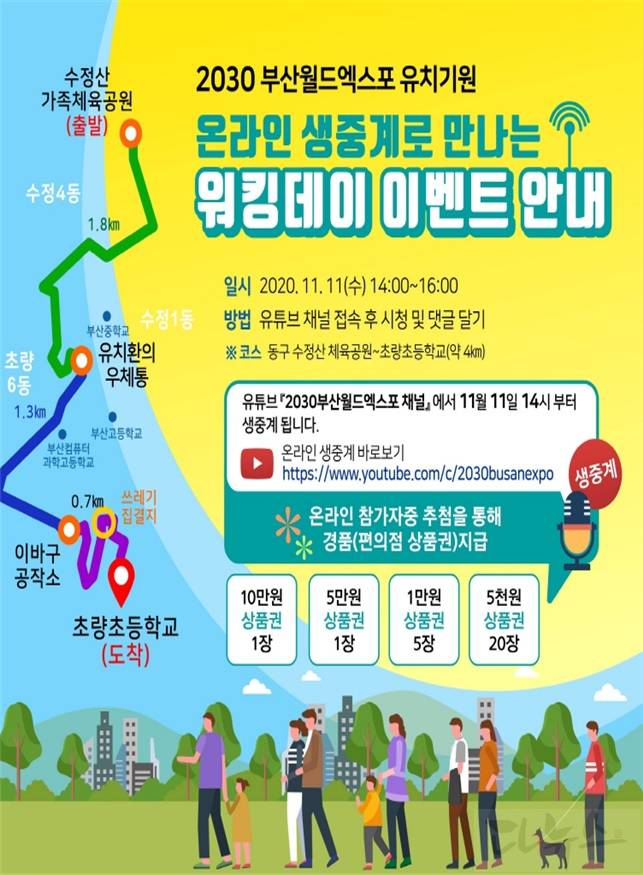 참가자는 산복도로 갈맷길을 엑스포 개최 예정지인 북항을 조망하며 두 시간 정도 걷게 되며 유튜브 엑스포 채널(www.youtube.com/c/2030busanexpo)에서 실시간 중계한다. 댓글을 통해 참여하는 누리꾼에게는 추첨을 통해 경품도 제공한다. 또한, 중구 등 10개 구에서도 자체적으로 걷기 행사와 연계하여 2030부산월드엑스포 유치 홍보 활동을 진행한다.