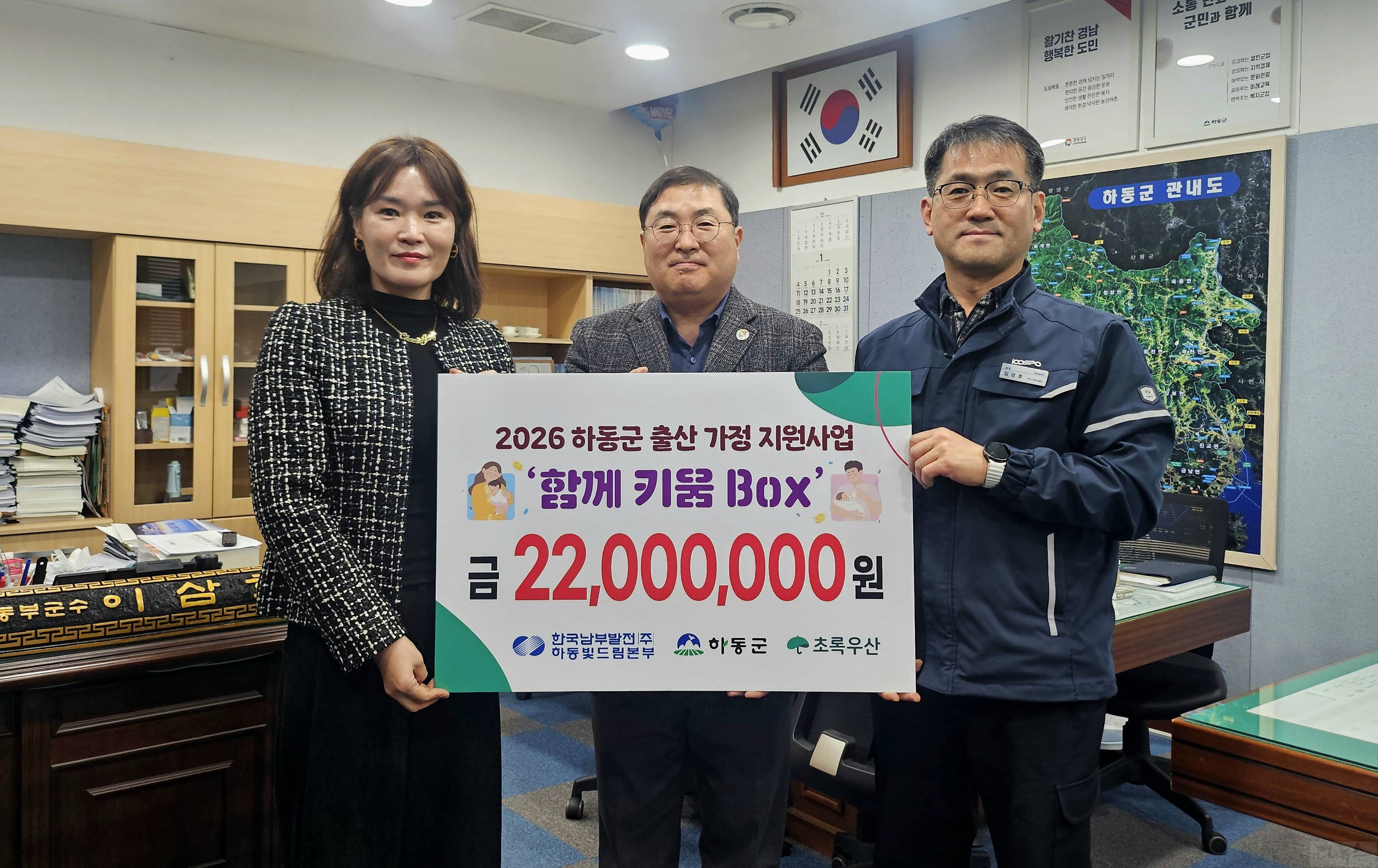 한국남부발전(주) 하동빛드림본부(본부장 이영재, 이하 하동본부)는 1월 19일(월) 하동군청에서 2026년도 하동군 출산 가정 지원을 위한 함께키움 BOX 후원 전달식을 가졌다.