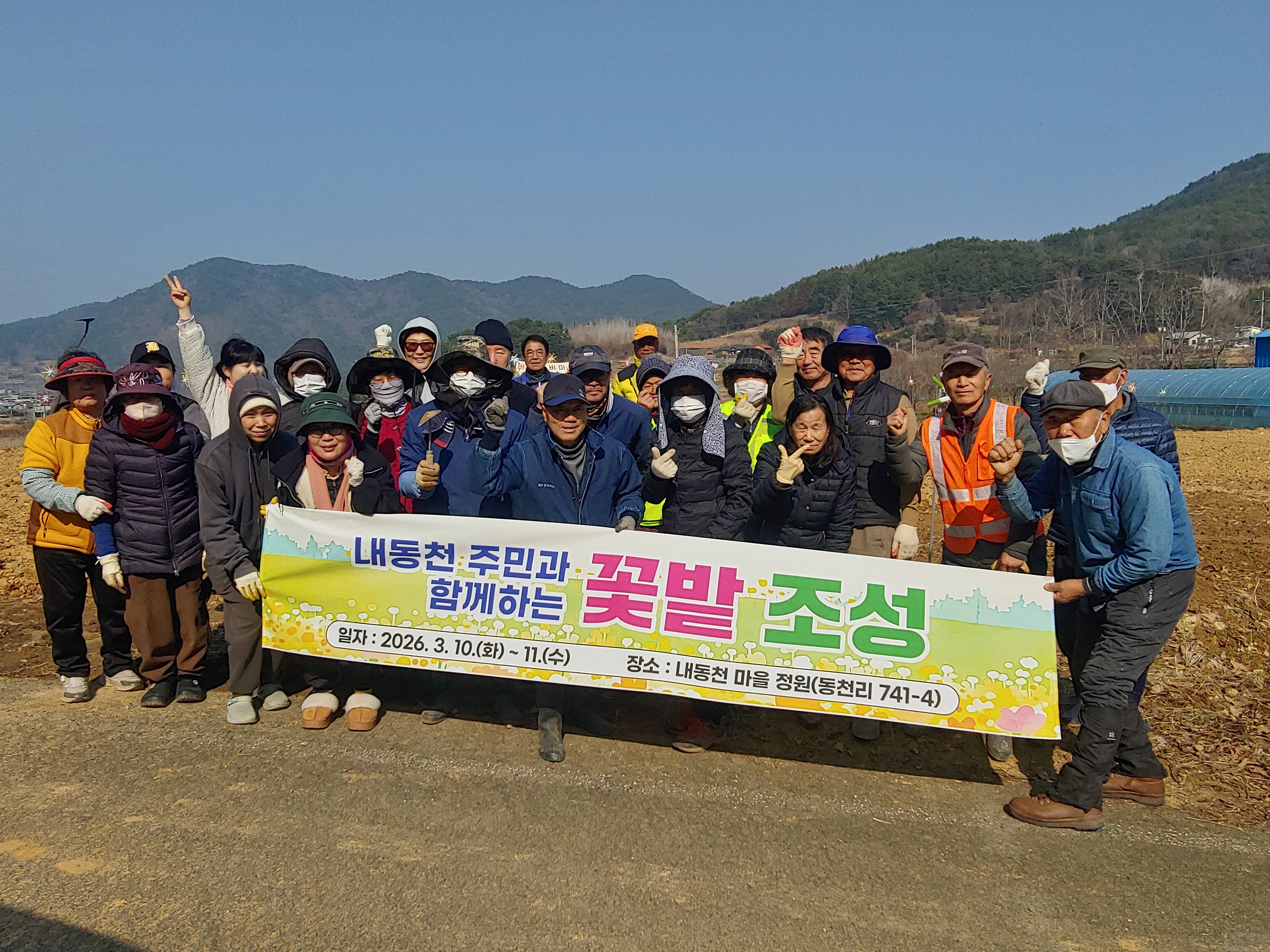 삼동면 내동천마을 주민들이 10∼11일 이틀간 동천리 741-4번지(537㎡) 부지에 마을 정원을 조성하고 버들마편초, 라벤더, 크리산세멈, 리빙스턴데이지, 금잔화, 팬지 등 여름꽃 4,000여 본을 심었다.